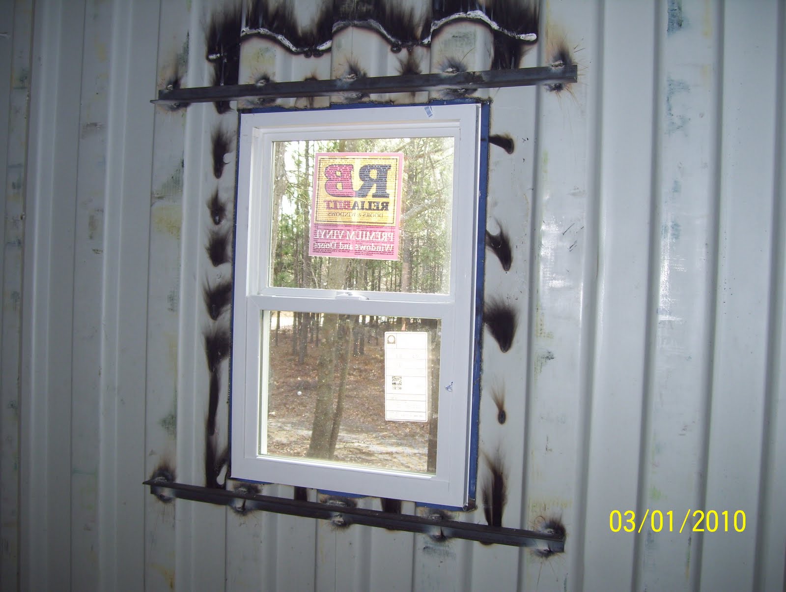 3/30/10 Things continue to move slowly for several reasons. The rainy weather has caused delays. The contractor is trying to juggle several jobs. Since it is a new concept for the county building inspectors, everything must be engineered and stamped. It is a new process for the engineer and he, too, is juggling jobs and doing research. Since the last post, we have gotten all the windows and the sliding glass door installed. Windows and doors are built to be installed against a flat surface, which must be created within a corrugated wall. We tried two different ways of installing the windows. One of the pictures shows how we have used 1/8" flat stock to bridge the low spots in the corrugation. Angle iron was used to true and stiffen the wall to receive the window. The other was a full frame made of angle iron. Another picture shows the concrete block bases for the support posts for the porch and carport roof. We hope to begin the framing next week which includes installing the roof trusses, building the decks and framing out the inside. As to the inside framing, we determined that an exterior sprayed foam shell was too expensive and we would use conventional insulation within an interior wood frame. Johnny felt this method would make electrical and plumbing installation more efficient. We are planning to further insulate and increase retro-reflectivity by adding ceramic beads to the exterior paint (see NASA web site on ceramic paint). We continue to shop at the Habitat for Humanity ReStores. An eight foot entry door with side lights for $95 is hard to beat. We also bought a full set of kitchen cabinets (no countertop) for $800. If anyone has questions or comments or suggestions as to information sources, you can email me at john@marmacwire.com.